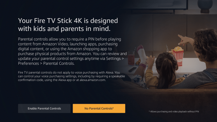 You can then choose to enable Parental Controls or not. If you do, you will be required to enter a PIN before playing any content, launching apps, and purchasing digital content or products from Amazon.