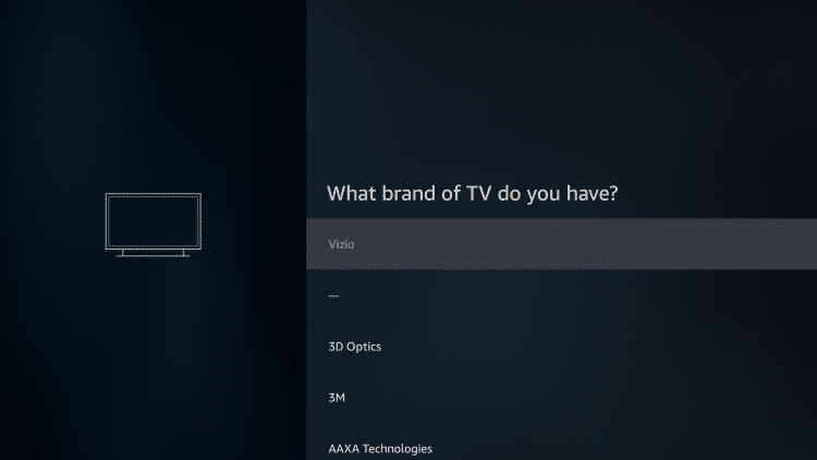 Next, you need to set up the provided Firestick remote with added power and volume buttons. Choose your brand of TV.