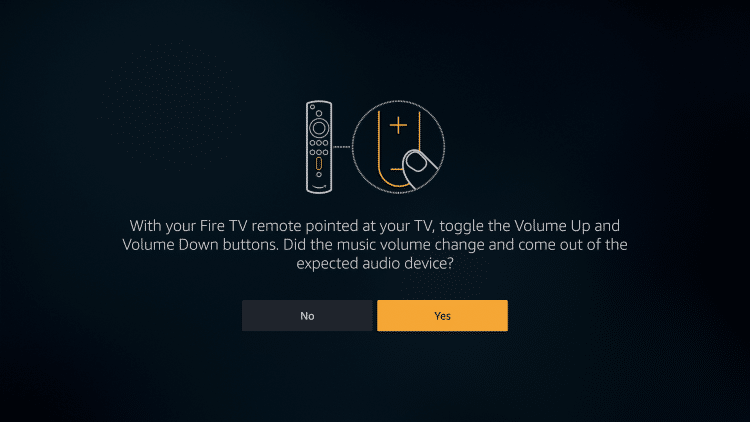 Adjust the volume to sync the Firestick remote with your device using the and buttons on your device. Click Yes when you have selected your ideal volume.